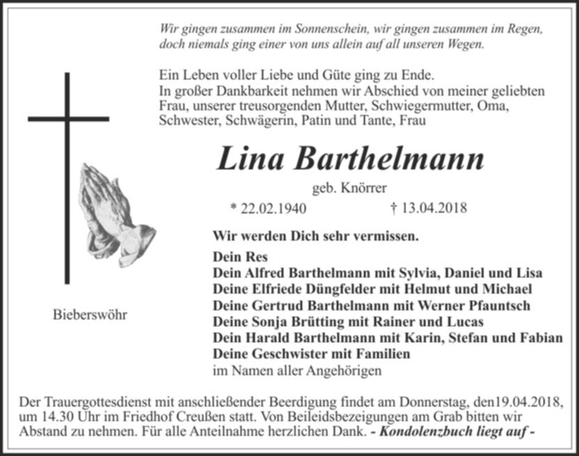 Der Trauergottesdienst mit anschließender Beerdigung findet am Donnerstag, den 19.04.2018, um 14.30 Uhr im Friedhof Creußen statt. Von Beileidsbezeigungen am Grab bitten wir Abstand zu nehmen. Für alle Anteilnahme herzlichen Dank. - Kondolenzbuch liegt auf -