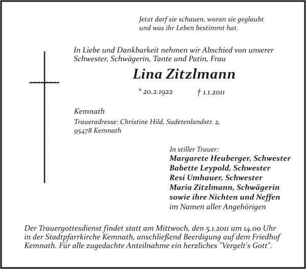 Die Aussegnung findet am Dienstag, den 4.1.2011 um 18:00 Uhr auf dem Friedhof in Kemnath statt. Die Beerdigung findet am Mittwoch, den 5.1.2011 um 14:00 Uhr auf dem Friedhof in Kemnath statt.