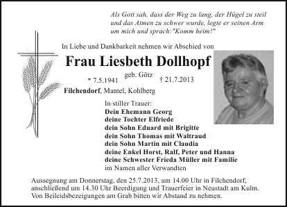 Aussegnung am Donnerstag, den 25.7.2013, um 14.00 Uhr in Filchendorf,