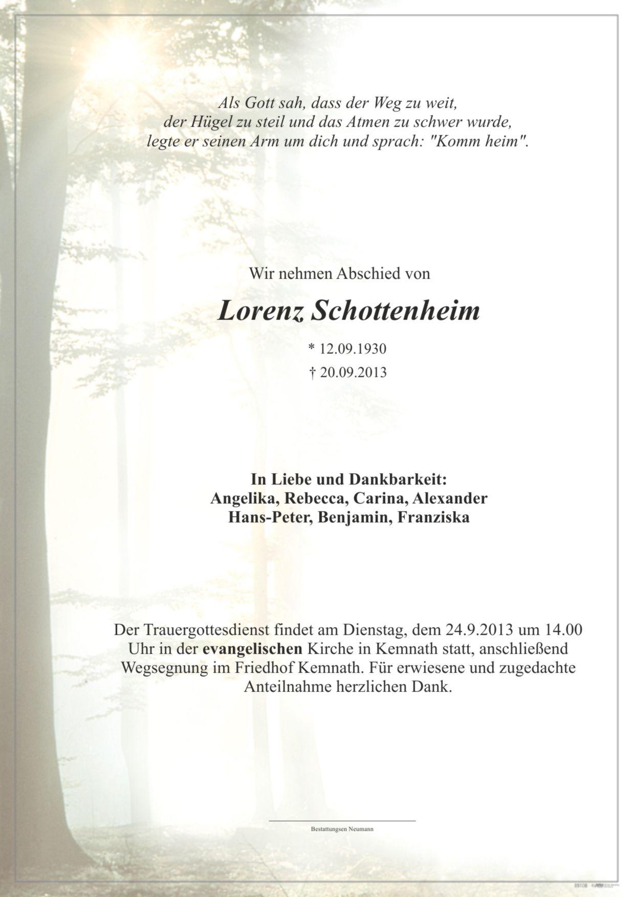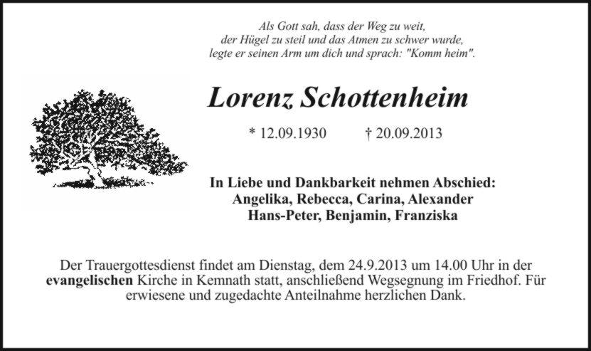 Der Trauergottesdienst findet am Dienstag, dem 24.9.2013 um 14.00 Uhr in der evangelischen Kirche in Kemnath statt, anschließend Wegsegnung im Friedhof. Für erwiesene und zugedachte Anteilnahme herzlichen Dank.