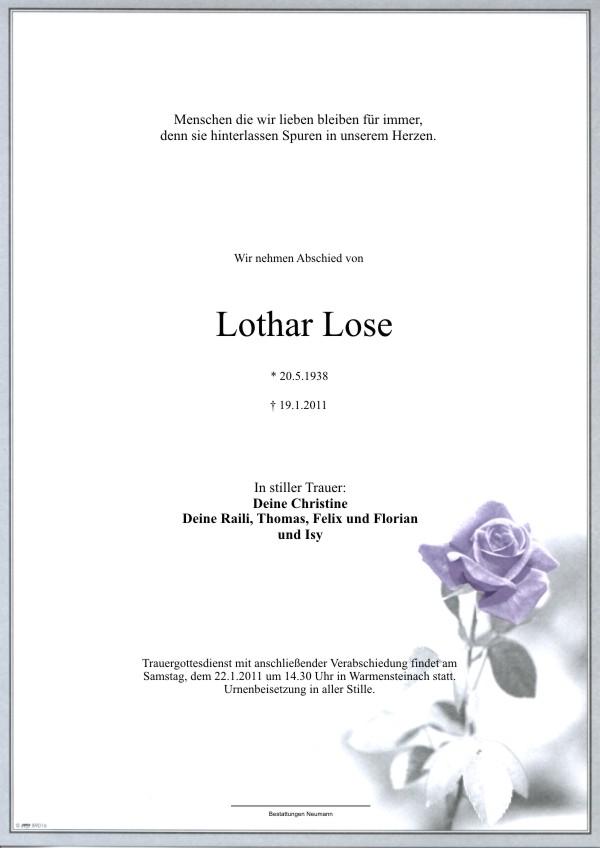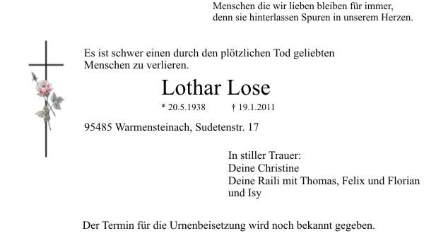 Wir möchten Ihnen unseres echtes Trauergefühl mitteilen. Wir behalten Herr Lothar in schönem Andenken. Wir haben besonders Erbarmen für die liebe Frau Christine, die Tochter Raili, der arme Vater Rudi, der Bruder Wolfgang, die Enkelkinder und die ganze Familie und Andehörigen. Von Herzen mit Euch Alle, Eure Freunde aus Frankreich.
