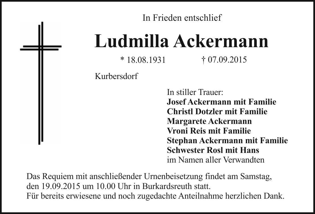 Das Requiem mit anschließender Urnenbeisetzung findet am Samstag, den 19.09.2015 um 10.00 Uhr in Burkardsreuth statt.