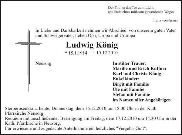 Die Beisetzung findet am Freitag, 17.12.2010 um 14:30 Uhr auf dem Friedhof in Neusorg statt.