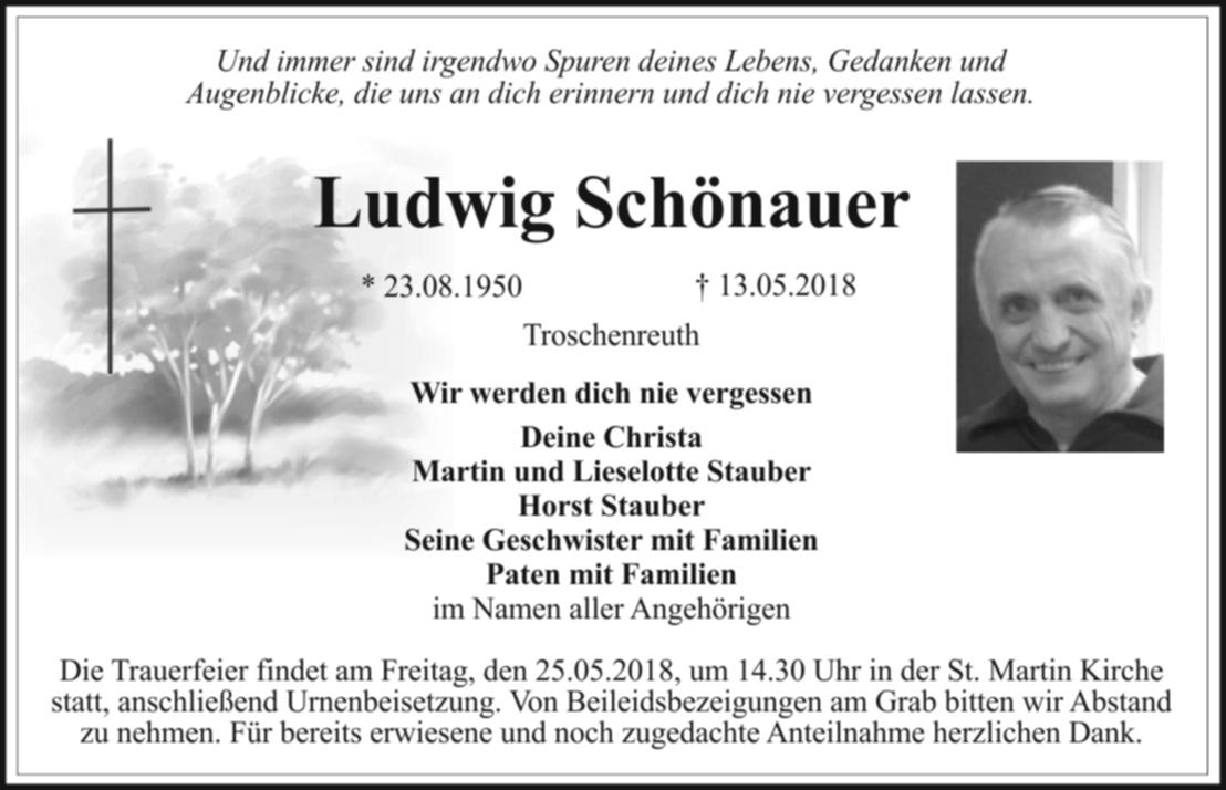 Die Trauerfeier findet am Freitag, den 25.05.2018, um 14.30 Uhr im Friedhof Troschenreuth statt, anschließend Urnenbeisetzung. Von Beileidsbezeigungen am Grab bitten wir Abstand zu nehmen. Für bereits erwiesene und noch zugedachte Anteilnahme herzlichen Dank.