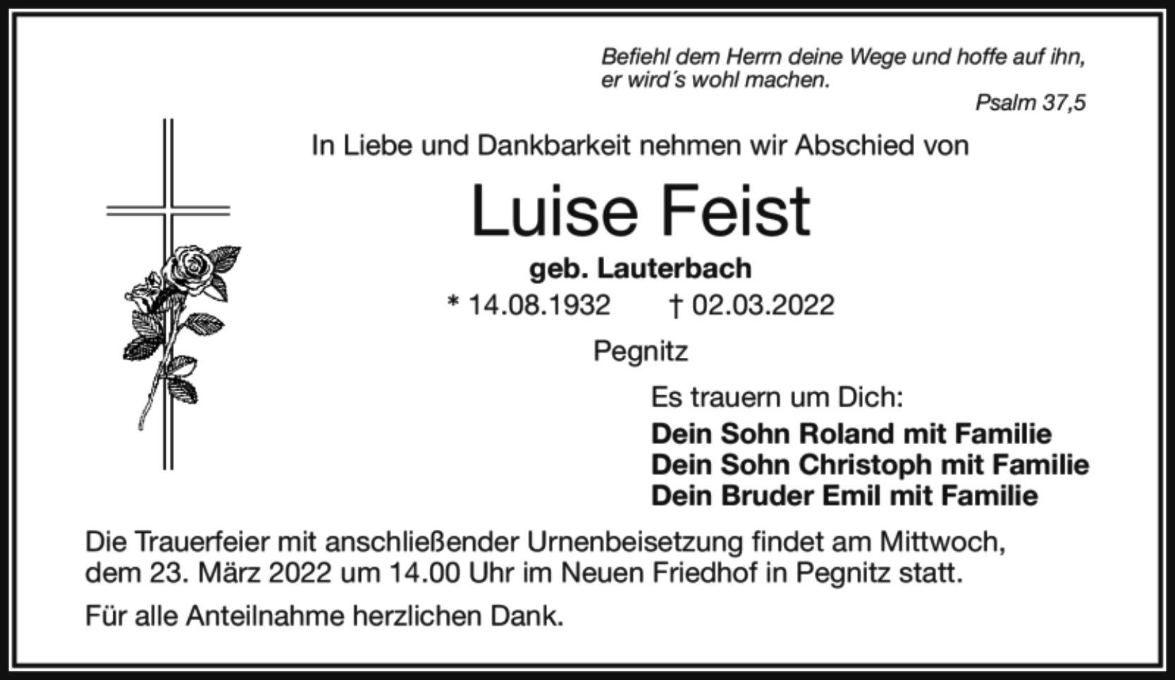 Die Trauerfeier mit anschließender Urnenbeisetzung findet am Mittwoch, den 22.03.2022 um 14.00 Uhr im Neuen Friedhof Pegnitz statt. Für alle Anteilnahme herzlichen Dank.