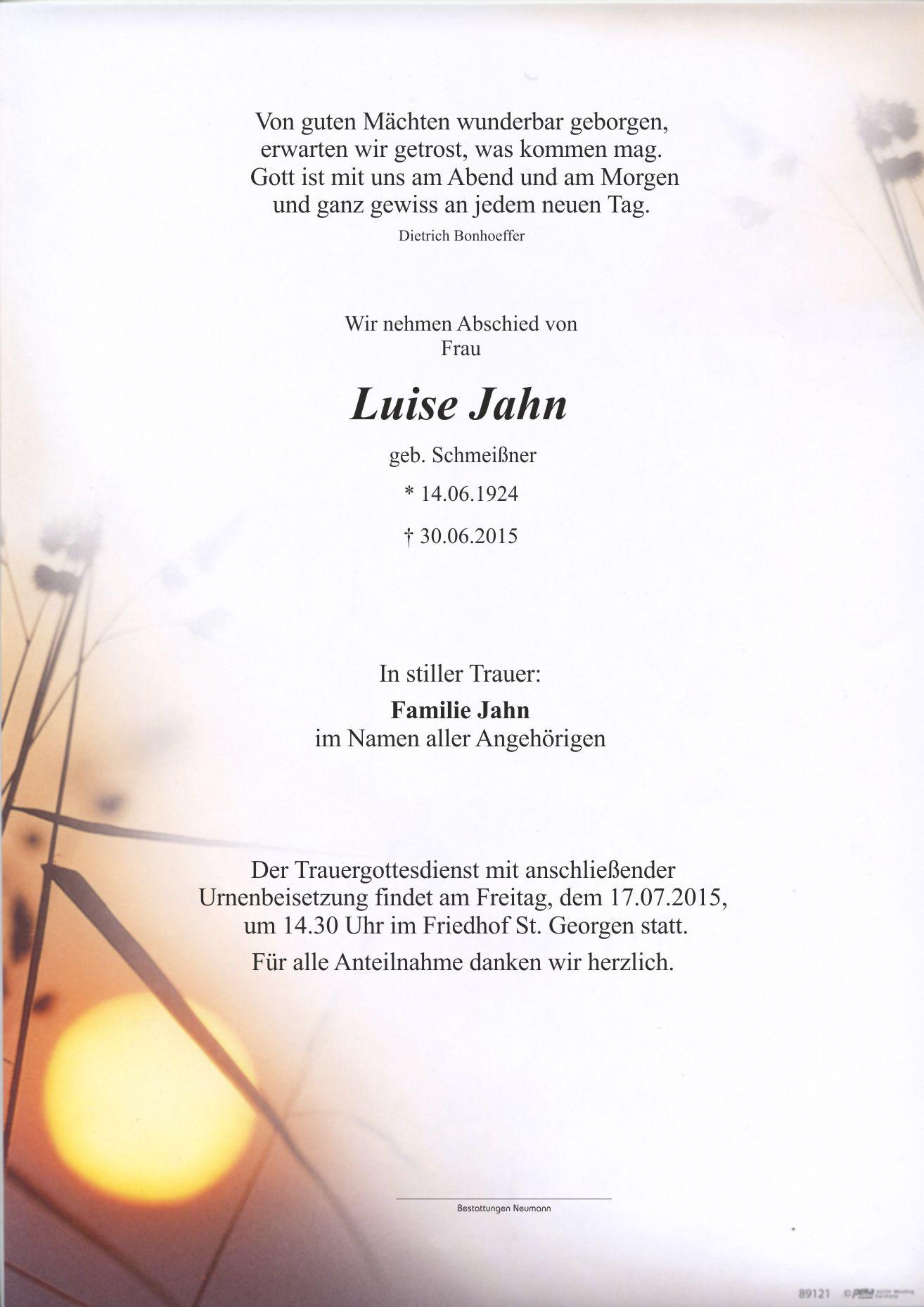 Der Trauergottesdienst mit anschließender Urnenbeisetzung findet am Freitag, dem 17.07.2015, 14.30 Uhr im Friedhof St. Georgen statt. Für alle Anteilnahme herzlichen Dank.