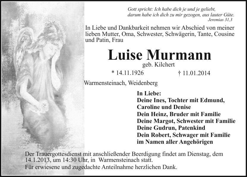 Der Trauergottesdienst mit anschließender Beerdigung findet am Dienstag, dem 14.1.2013, um 14:30 Uhr, in Warmensteinach statt.