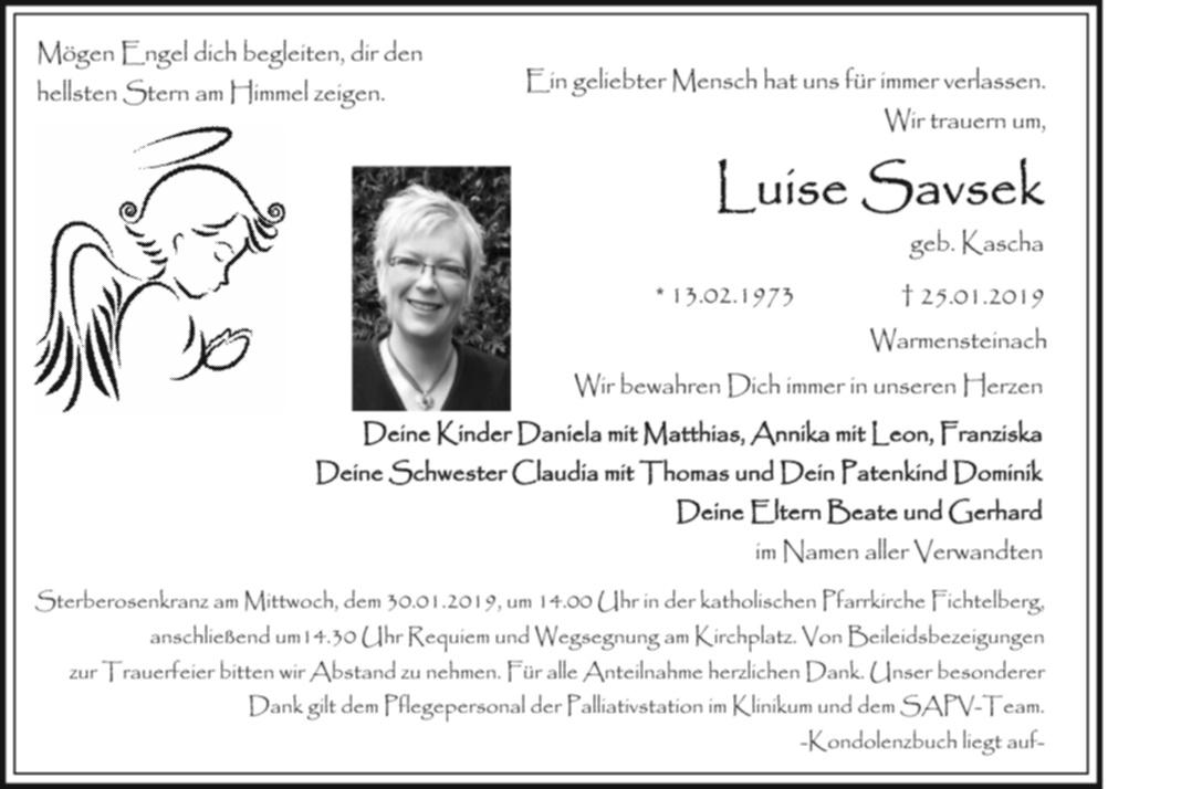 Sterberosenkranz am Mittwoch, dem 30.01.2019, um 14.00 Uhr in der katholischen Pfarrkirche in Fichtelberg, anschließend um 14.30 Uhr Requiem und Wegsegnung auf dem Kirchplatz. Von Beileidsbezeigungen bei der Trauerfeier bitten wir Abstand zu nehmen. Für alle Anteilnahme sagen wir herzlichen Dank.