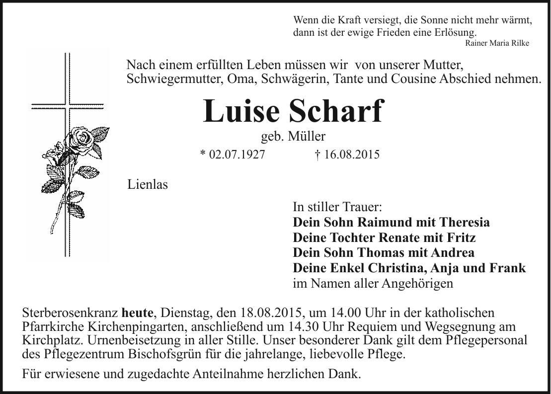 Sterberosenkranz heute, Dienstag, den 18.08.2015, um 14.00 Uhr in der katholischen Pfarrkirche Kirchenpingarten, anschließend um 14.30 Uhr Requiem und Wegsegnung am Kirchplatz. Urnenbeisetzung in aller Stille. Unser besonderer Dank gilt dem Pflegepersonal des Pflegezentrums Bischofsgrün für die jahrelange, liebevolle Pflege.