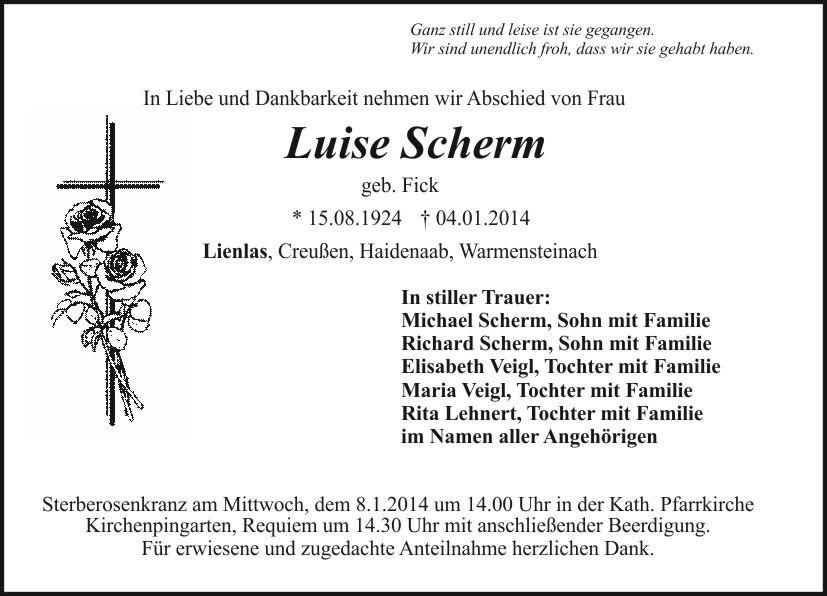 Sterberosenkranz am Mittwoch, dem 8.1.2014 um 14.00 Uhr in der Kath. Pfarrkirche Kirchenpingarten, Requiem um 14.30 Uhr mit anschließender Beerdigung.