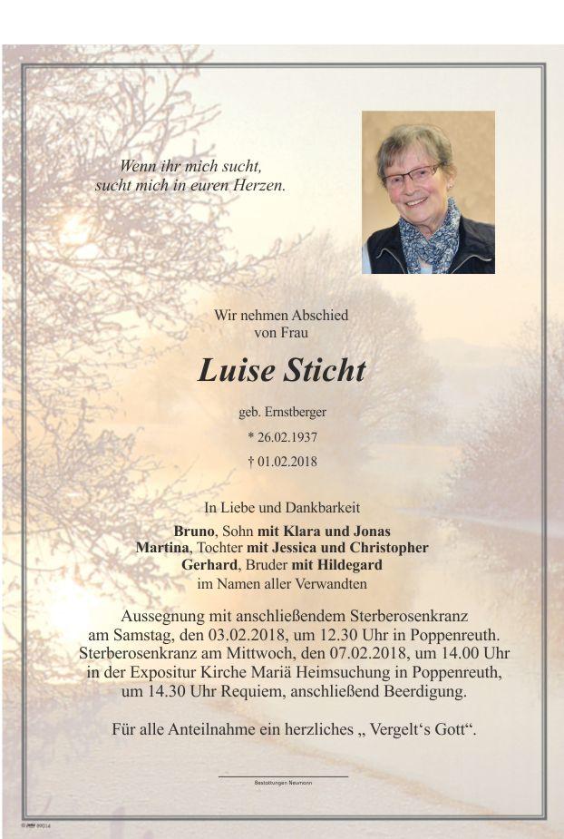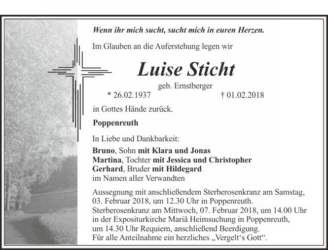Aussegnung mit anschließendem Rosenkranz am Samstag, 03. Februar 2018, um 12.30 Uhr in Poppenreuth. Sterberosenkranz am Mittwoch, 07. Februar 2018, um 14.00 Uhr in der Expositurkirche Mariä Heimsuchung in Poppenreuth, um 14.30 Uhr Requiem, anschließend Beerdigung. Für alle Anteilnahme ein herzliches " Vergelt's Gott ".