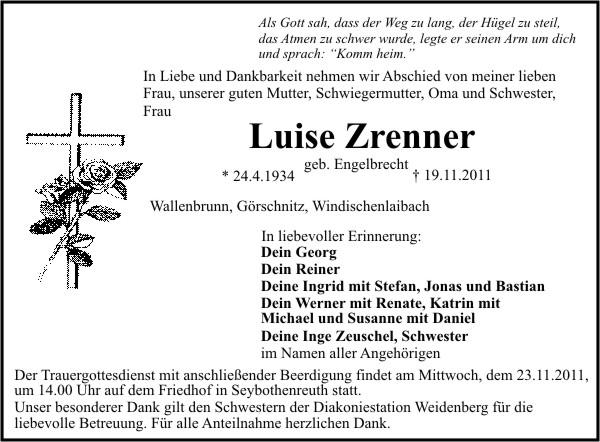 Der Trauergottesdienst mit anschließender Beerdigung findet am Mittwoch, dem 23.11.2011, um 14.00 Uhr auf dem Friedhof in Seybothenreuth statt.