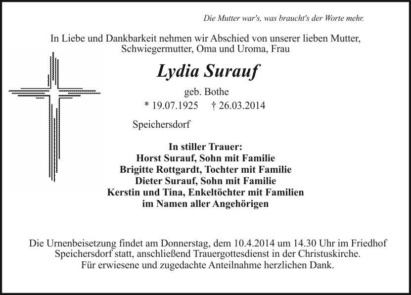 Die Urnenbeisetzung findet am Donnerstag, dem 10.4.2014 um 14.30 Uhr im Friedhof Speichersdorf statt, anschließend Trauergottesdienst in der Christuskirche.