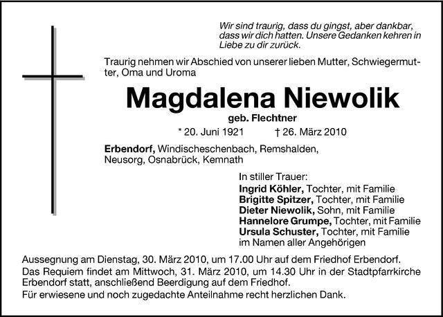 Die Beisetzung findet am Mittwoch, 31.03.2010 um 14:30 Uhr auf dem Friedhof in Erbendorf statt.