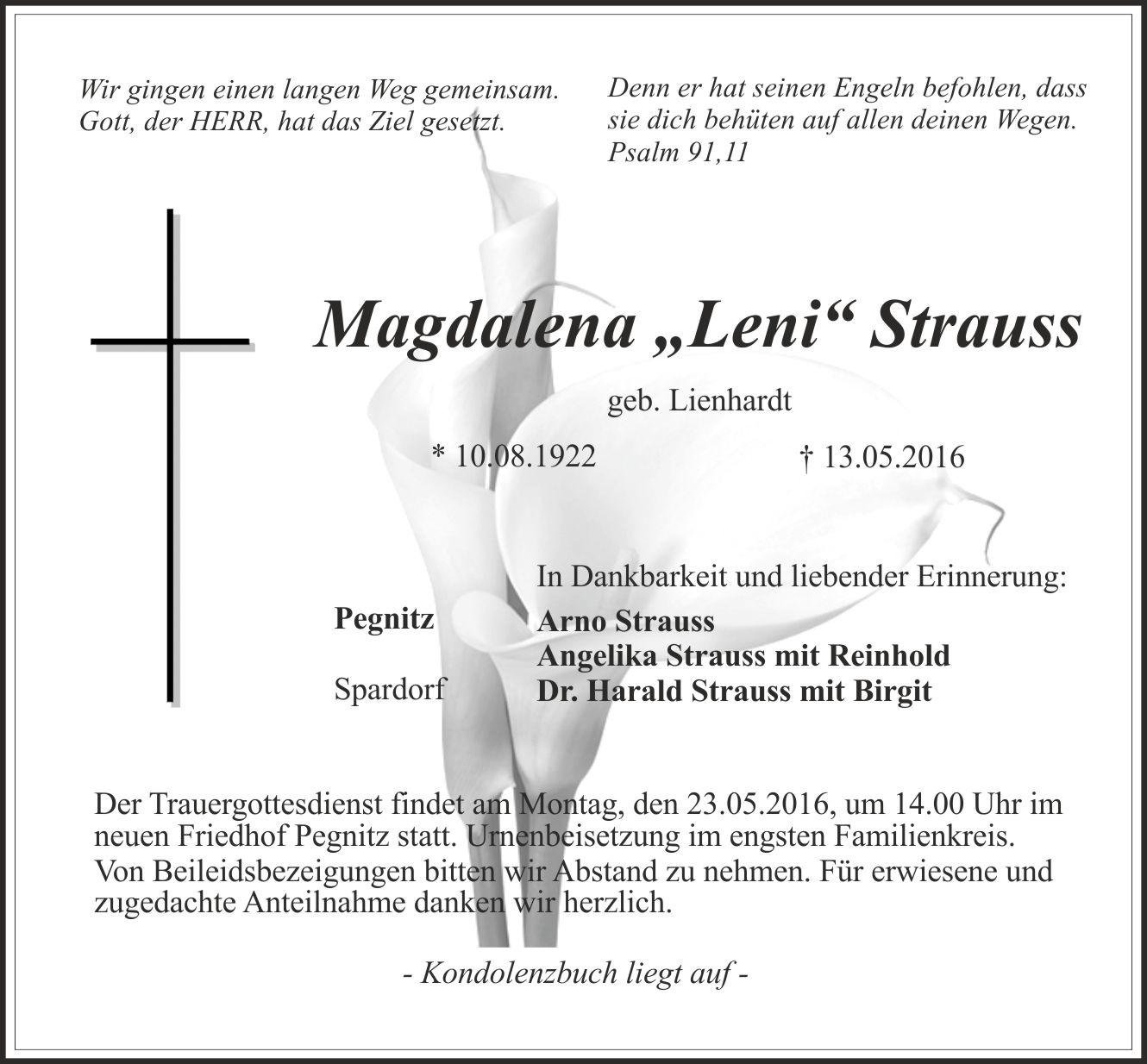 Der Trauergottesdienst findet am Montag, den 23.05.2016, um 14.00 Uhr im neuen Friedhof Pegnitz statt. Urnenbeisetzung im engsten Familienkreis. Von Beileidsbezeigungen bitten wir Abstand zu nehmen. Für erwiesene und noch zugedachte Anteilnahme danken wir herzliche. - Kondolenzbuch liegt auf -