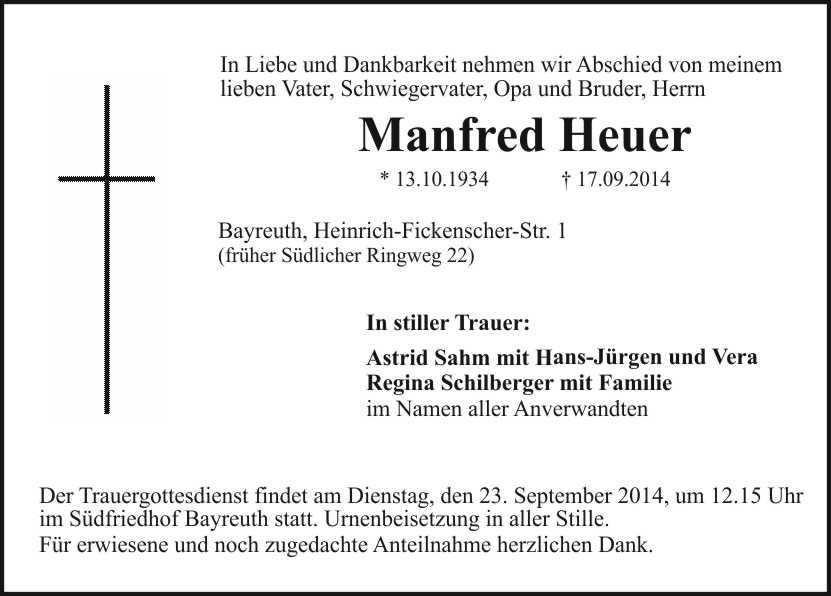 Der Trauergottesdienst findet am Dienstag, den 23. September 2014, um 12.15 Uhr auf dem Südfriedhof Bayreuth statt. Urnenbeisetzung in aller Stille.