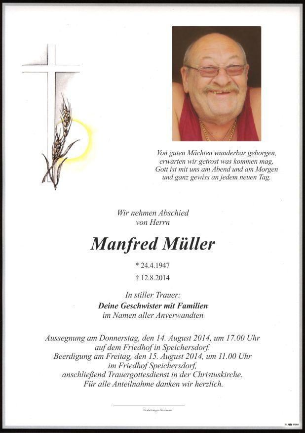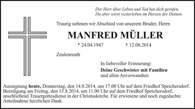 Aussegnung heute, Donnerstag, den 14.8.2014, um 17.00 Uhr auf dem Friedhof Speichersdorf. Beerdigung am Freitag, den 15.8.2014, um 11.00 Uhr auf dem Friedhof Speichersdorf, anschließend Trauergottesdienst in der Christuskirche. Für erwiesene und noch zugedachte Anteilnahme herzlichen Dank.
