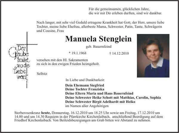 Der Trauergottesdienst findet am Freitag, 17.12.2010 um 14.30 Uhr in der Pfarrkirche Kirchenlaibach statt, anschließend Beerdigung auf dem Friedhof Kirchenlaibach.