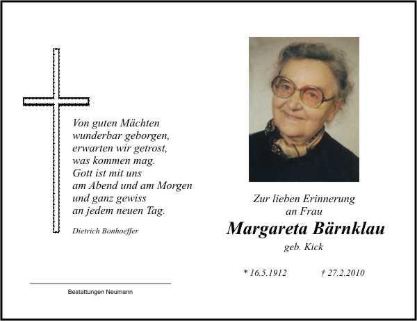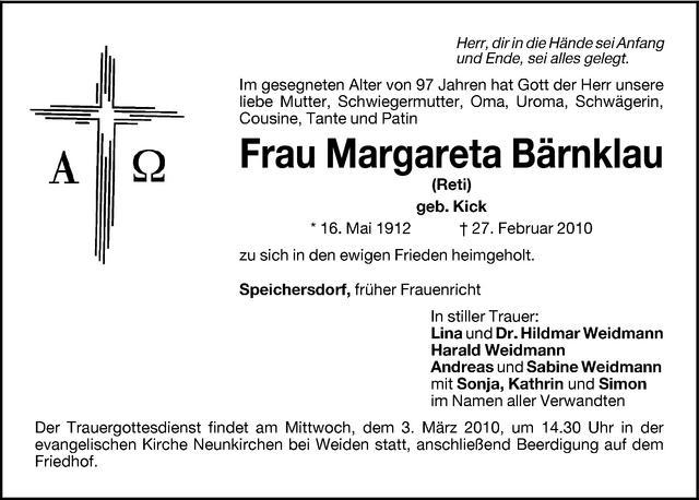 Der Trauergottesdienst findet am Mittwoch, 3.3.2010 um 14.30 Uhr in der evang. Kirche Neunkirchen bei Weiden statt, anschließend Beerdigung auf dem Friedhof.