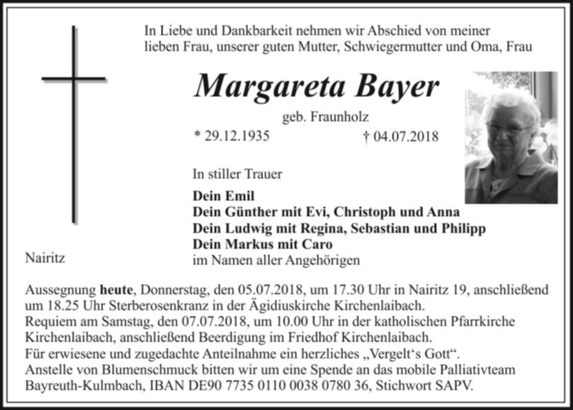 Aussegnung heute, Donnerstag, den 05.07.2018, um 17.30 Uhr in Nairitz 19, anschließend um 18.25 Uhr Sterberosenkranz in der Ägidiuskirche Kirchenlaibach.