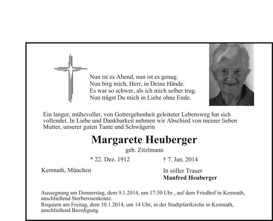 Aussegnung am Donnerstag, dem 9.1.2014 um 17.30 Uhr im Friedhof Kemnath, anschließend Sterberosenkranz.