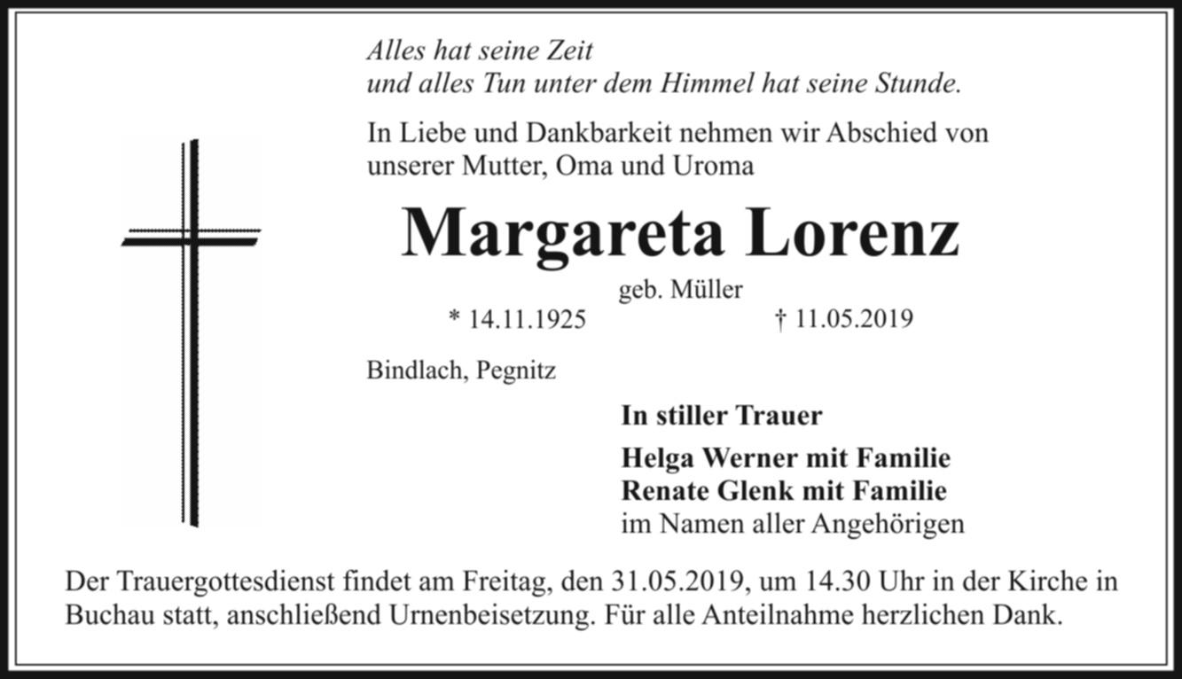 Der Trauergottesdienst findet am Freitag, den 31.05.2019, um 14.30 Uhr in der Kirche in Buchau statt, anschließend Urnenbeisetzung. Für alle Anteilnahme herzlichen Dank.