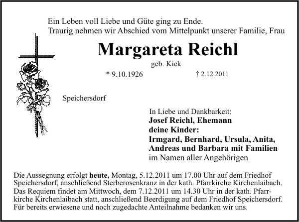 Das Requiem findet am Mittwoch, dem 7.12.2011 um 14.30 Uhr in der kath. Pfarr-kirche Kirchenlaibach statt, anschließend Beerdigung auf dem Friedhof Speichersdorf. Für bereits erwiesene und noch zugedachte Anteilnahme bedanken wir uns.