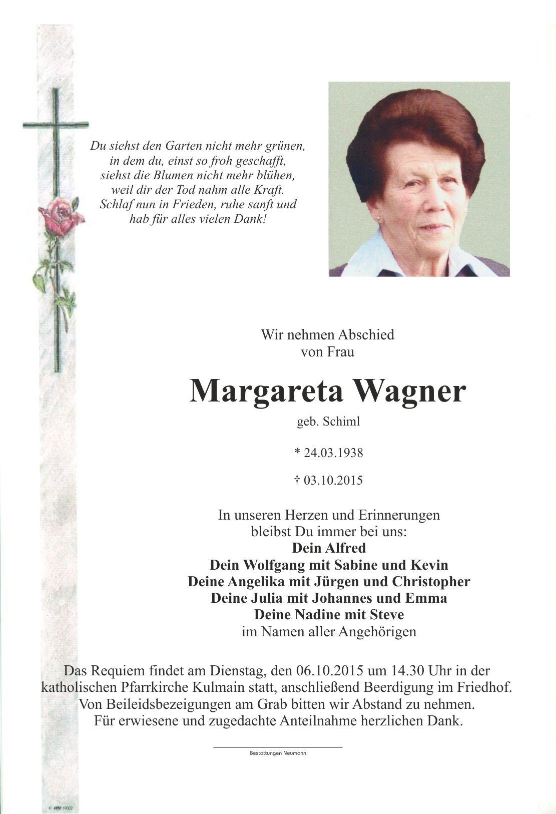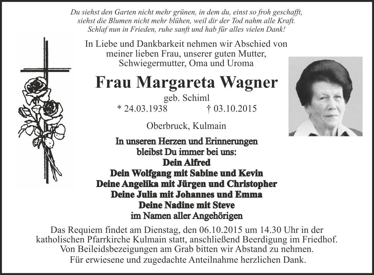 Requiem am Dienstag, den 06.10.2015, um 14.30 Uhr in der katholischen Pfarrkirche Kulmain, anschließend Beerdigung im Friedhof. Von Beileidsbezeigungen am Grab bitten wir Abstand zu nehmen. Für bereits erwiesene und noch zugedachte Anteilnahme herzlichen Dank.