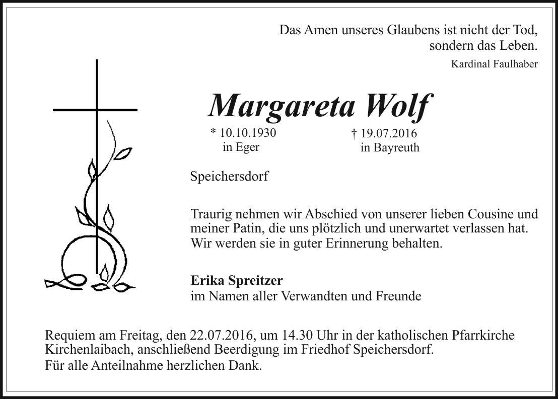 Requiem am Freitag, den 22.07.2016, um 14.30 Uhr in der katholischen Pfarrkirche Kirchenlaibach, anschließend Beerdigung im Friedhof Speichersdorf.