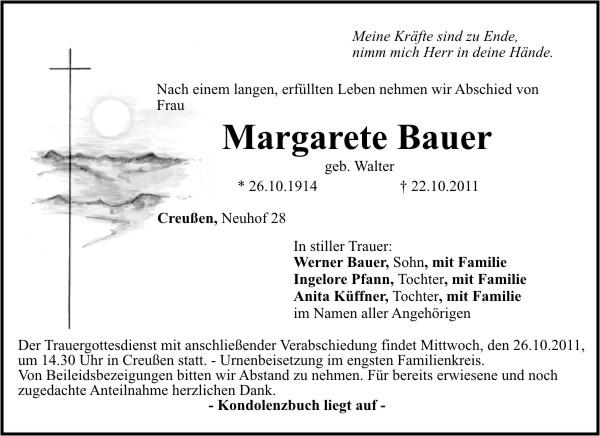 Der Trauergottesdienst mit anschließender Verabschiedung findet Mittwoch, den 26.10.2011, um 14.30 Uhr in Creußen statt. - Urnenbeisetzung im engsten Familienkreis.