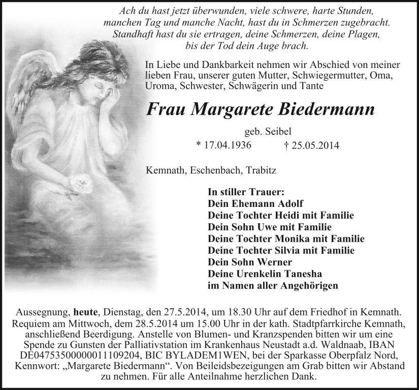 Kennwort: "Margarete Biedermann". Von Beileidsbezeigungen am Grab bitten wir Abstand zu nehmen. Für alle Anteilnahme herzlichen Dank.