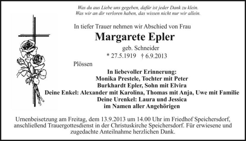 Urnenbeisetzung am Freitag, dem 13.9.2013 um 14.00 Uhr im Friedhof Speichersdorf, anschließend Trauergottesdienst in der Christuskirche Speichersdorf. Für erwiesene und zugedachte Anteilnahme herzlichen Dank.