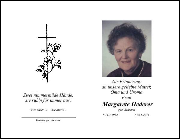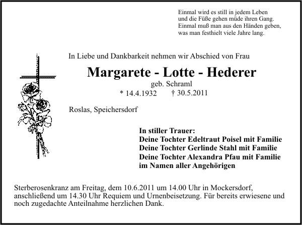 Die Beisetzung findet am Freitag, 10.06.2011 um 14:30 Uhr auf dem Friedhof in Mockersdorf statt.