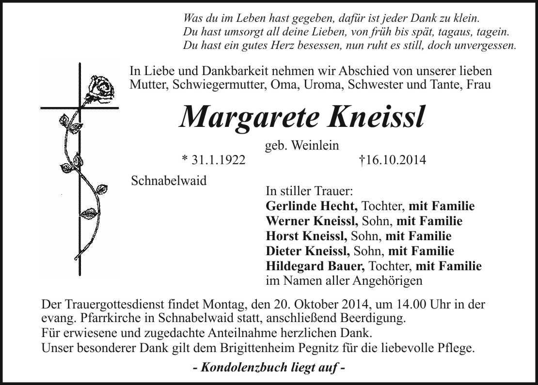 Der Trauergottesdienst findet Montag, den 20. Oktober 2014, um 13.00 Uhr in der evang. Pfarrkirche in Schnabelwaid statt, anschließend Beerdigung.