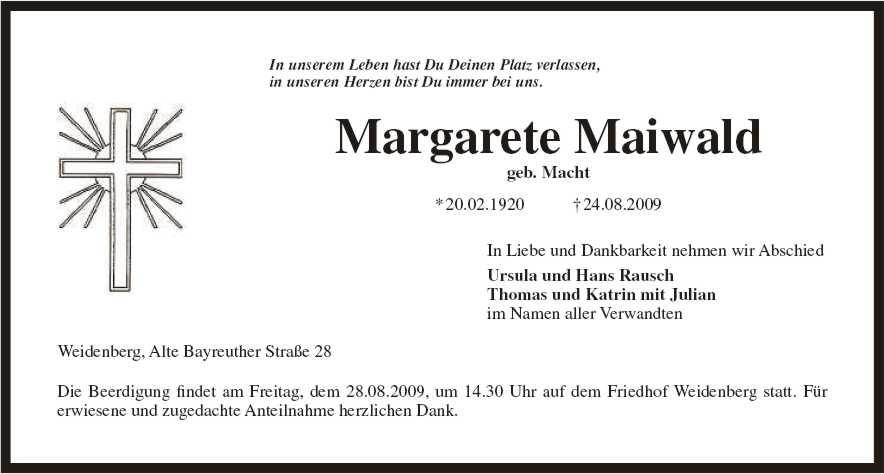 Die Beisetzung findet am Freitag, 28.08.2009 um 14:30 Uhr auf dem Friedhof in Weidenberg statt.