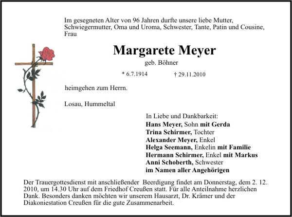 Die Beisetzung findet am Donnerstag, 02.12.2010 um 14:30 Uhr auf dem Friedhof in Creußen statt.