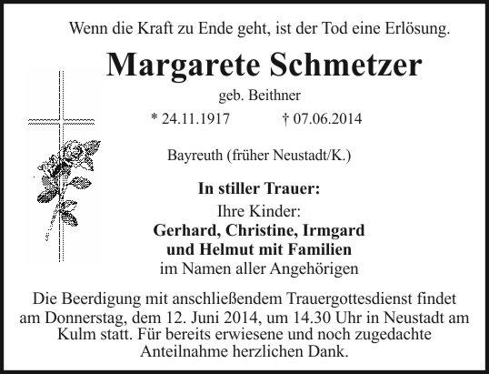 am Donnerstag, dem 12. Juni 2014, um 14.30 Uhr in Neustadt am Kulm statt. Für bereits erwiesene und noch zugedachte Anteilnahme herzlichen Dank.