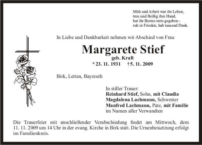 Die Trauerfeier findet am Mittwoch dem 11.11.2009 um 14.00 Uhr in der evangelischen Kirche in Birk statt anschließend Wegsegnung.