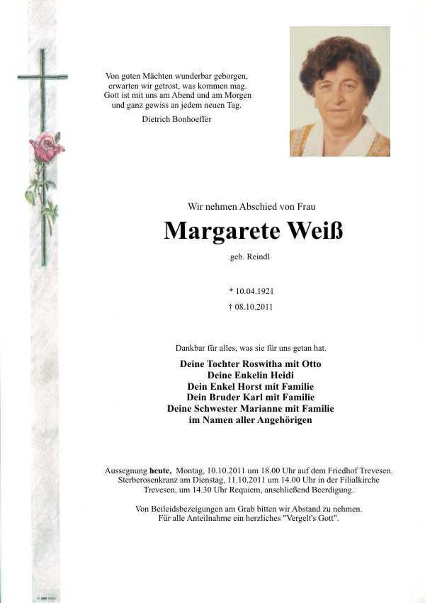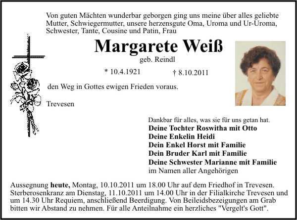 Sterberosenkranz am Dienstag, 11.10.2011 um 14.00 Uhr in der Filialkirche Trevesen, um 14.30 Uhr Requiem, anschließend Beerdigung.