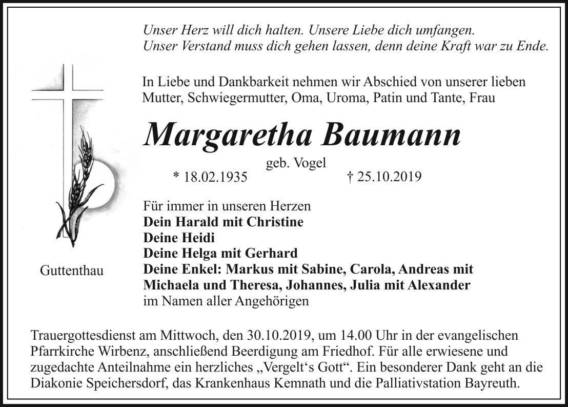 Trauergottesdienst am Mittwoch, den 30.10.2019, um 14.00 Uhr in der evangelischen Pfarrkirche Wirbenz, anschließend Beerdigung am Friedhof. Für alle erwiesene und zugedachte Anteilnahme ein herzliches „Vergelt‘s Gott“. Ein besonderer Dank geht an die Diakonie Speichersdorf, das Krankenhaus Kemnath und die Palliativstation Bayreuth.