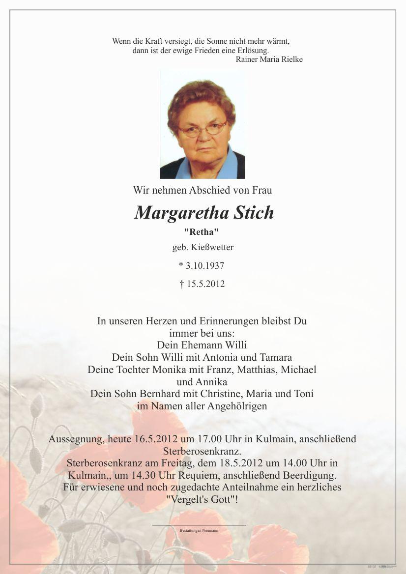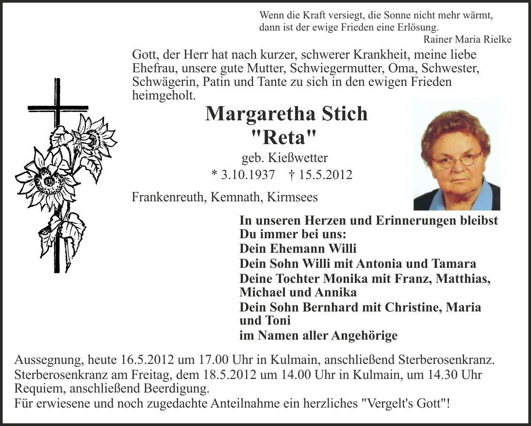 Sterberosenkranz am Freitag, dem 18.5.2012 um 14.00 Uhr in Kulmain, um 14.30 Uhr Requiem, anschließend Beerdigung.