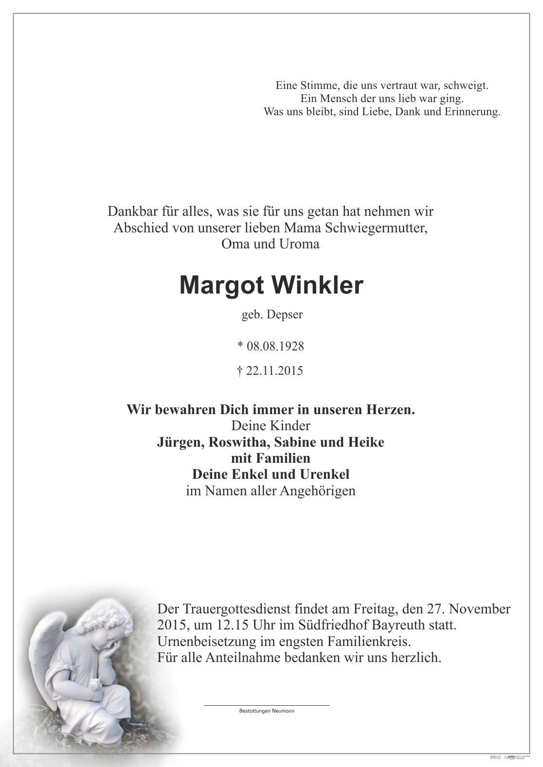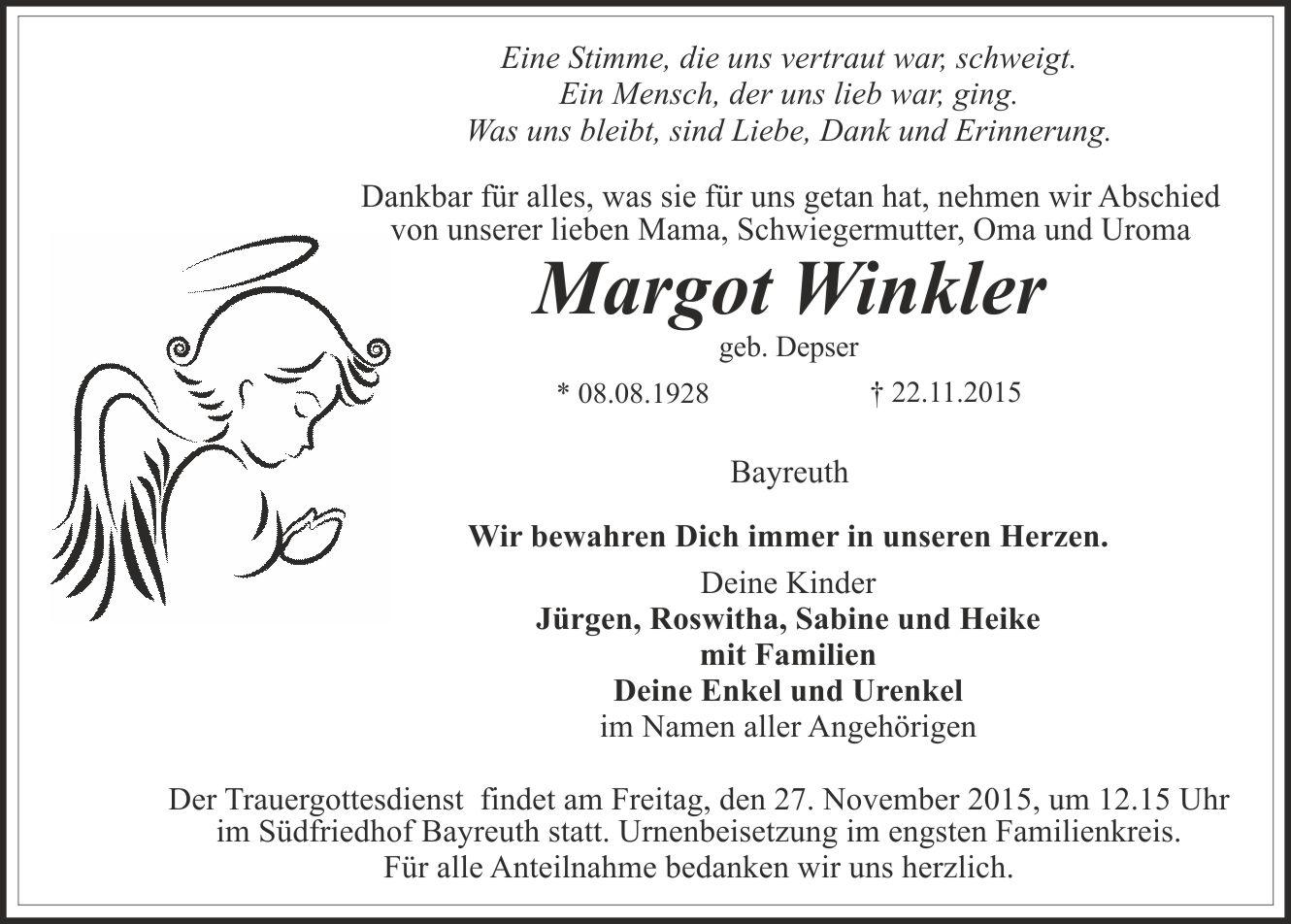 Der Trauergottesdienst findet am Freitag, den 27. November 2015, um 12.15 Uhr im Südfriedhof Bayreuth statt. Urnenbeisetzung im engsten Familienkreis.