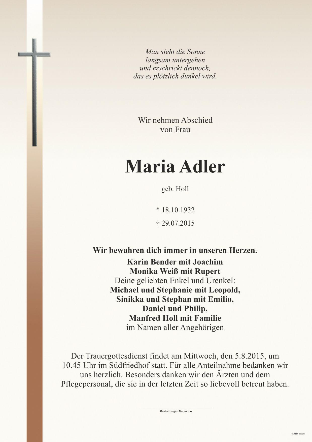 Der Trauergottesdienst findet am Mittwoch, den 05.08.2015, um 10.45 Uhr im Südfriedhof statt. Für alle Anteilnahme bedanken wir uns herzlich. Besonders danken wir den Ärzten und dem Pflegepersonal, die sie in der letzten Zeit so liebevoll betreut haben.