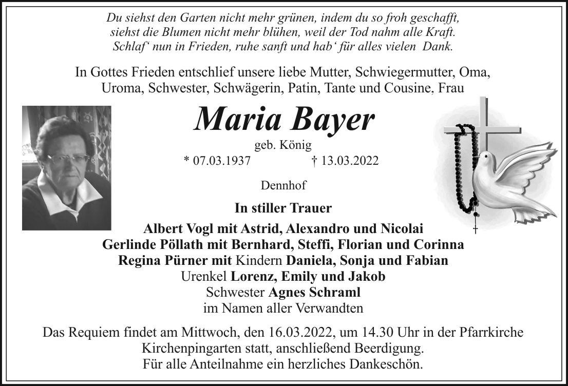 Aussegnung heute, Montag, 14.03.2022, um 18.30 Uhr im Friedhof Kirchenpingarten. Das Requiem findet am Mittwoch, den 16.03.2022, um 14.30 Uhr in der Pfarrkirche Kirchenpingarten statt, anschließend Beerdigung.