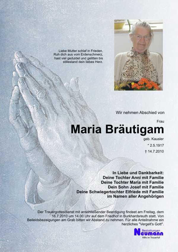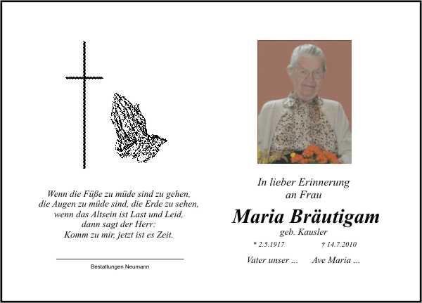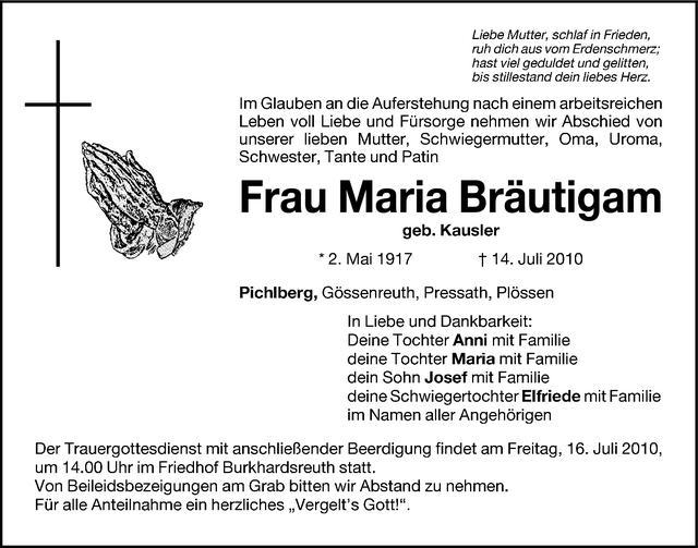 Die Beisetzung findet am Freitag, 16.07.2010 um 14:00 Uhr auf dem Friedhof in Burkhardsreuth statt.