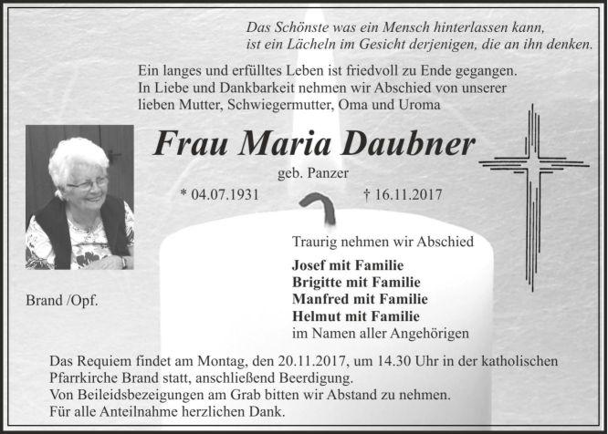 Trauergottesdienst am Montag, den 20.11.2017, um 14.30 Uhr in der Pfarrkirche Brand, anschließend Beerdigung.