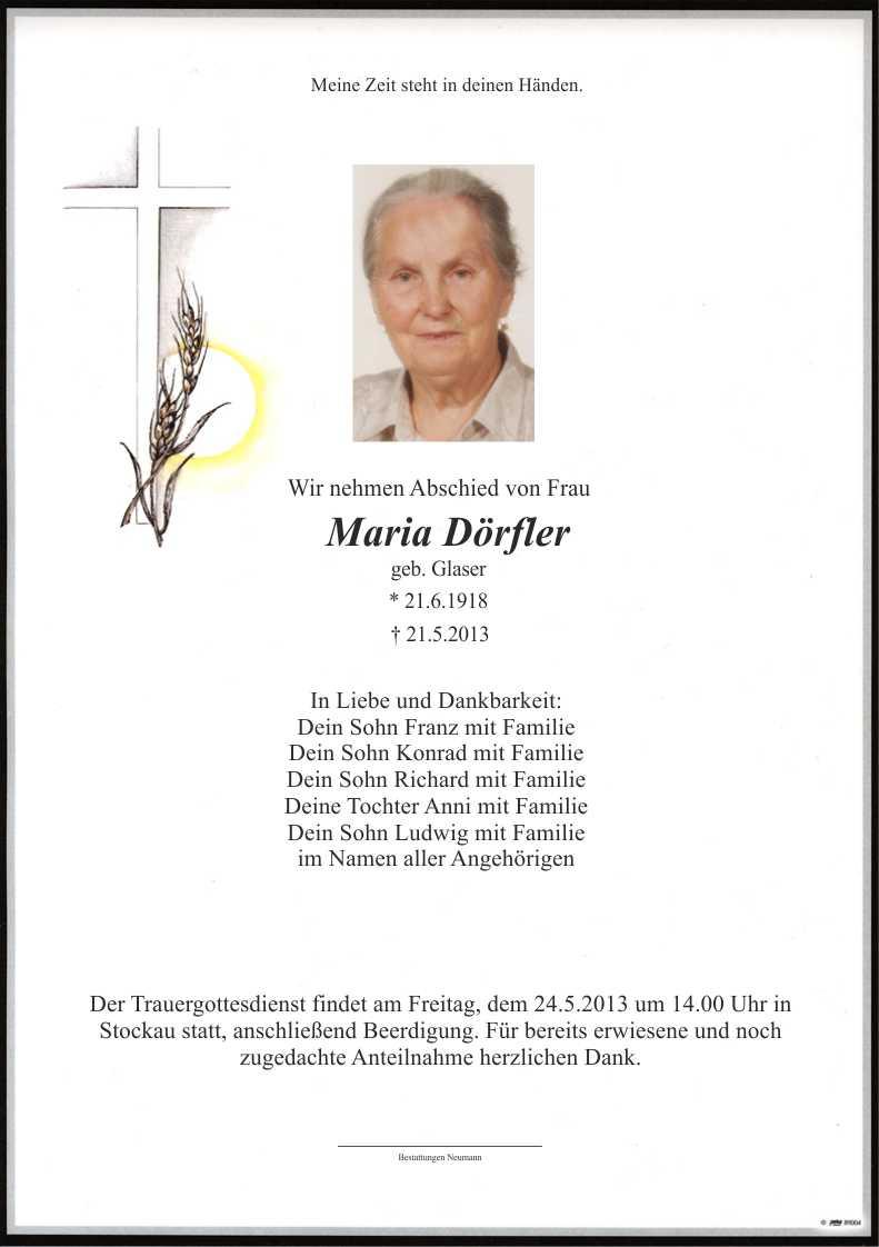 Der Trauergottesdienst findet am Freitag, dem 24.5.2013 um 14.00 Uhr in Stockau statt, anschließend Beerdigung. Für bereits erwiesene und noch zugedachte Anteilnahme herzlichen Dank.