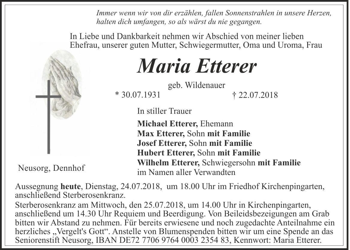 Sterberosenkranz am Mittwoch, den 25.07.2018, um 14.00 Uhr in der katholischen Pfarrkirche Kirchenpingarten, anschließend um 14.30 Uhr Requiem und Beerdigung. Für alle Anteilnahme ein herzliches "Vergelt's Gott".