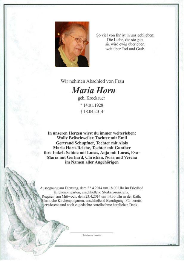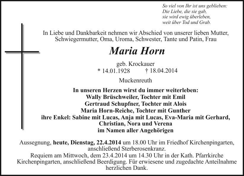 Requiem am Mittwoch, dem 23.4.2014 um 14.30 Uhr in der Kath. Pfarrkirche Kirchenpingarten, anschließend Beerdigung. Für erwiesene und zugedachte Anteilnahme herzlichen Dank.