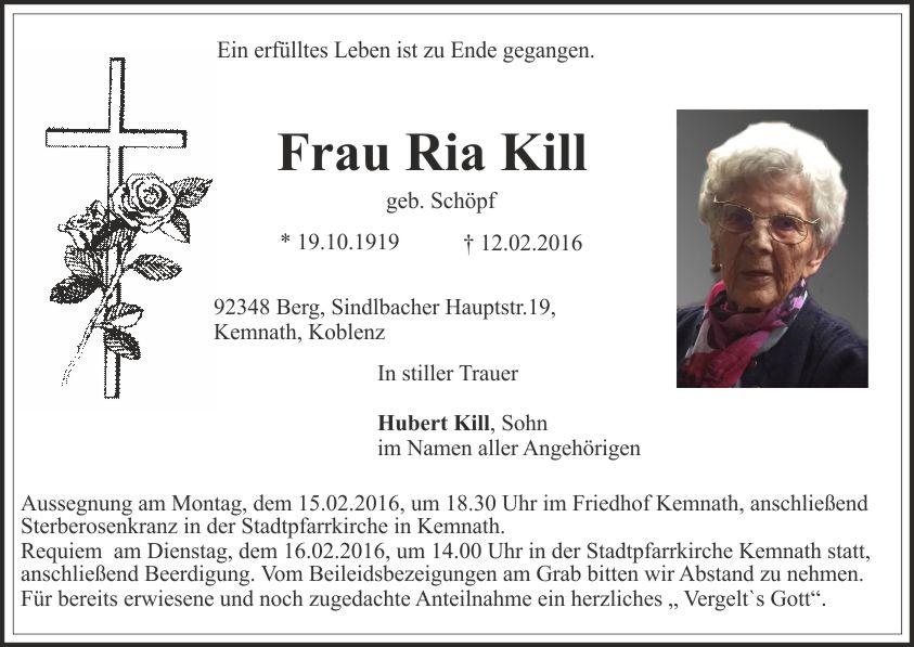 Aussegnung am Montag, dem 15.02.2016, um 18.30 Uhr im Friedhof Kemnath, anschließend Sterberosenkranz in der Stadtpfarrkirche in Kemnath.